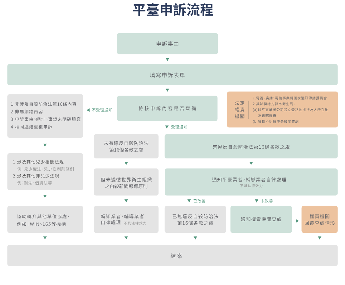(五)申訴處理機制:該平臺將依自殺防治法及世界衛生組織自殺新聞報導原則,檢視網路媒體不當自殺內容,並通知前揭業者予以自律處理,並於申訴受理後7個工作天內回復處理情形。